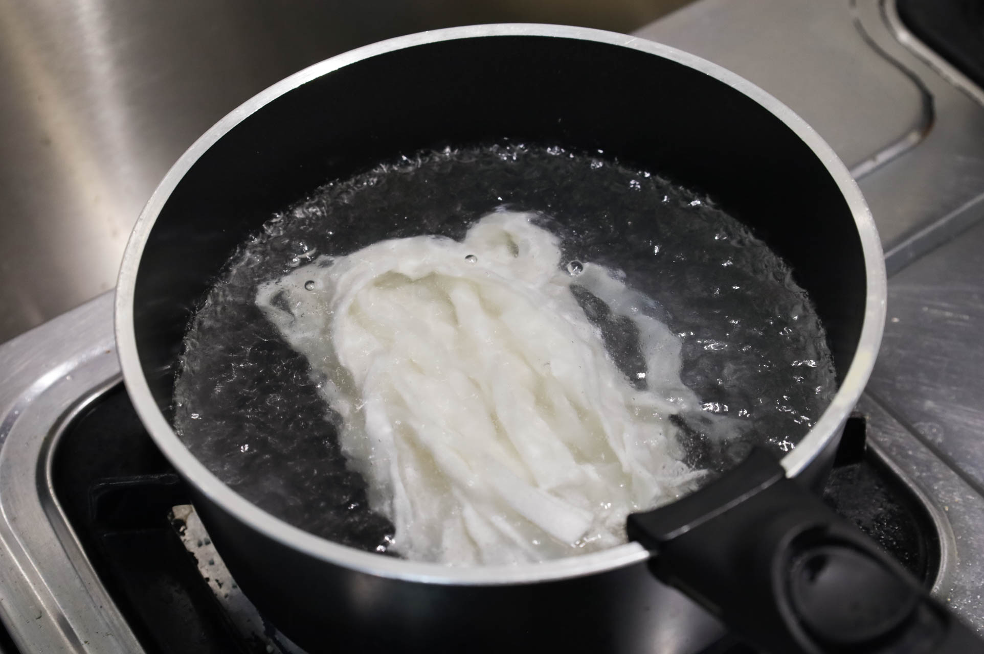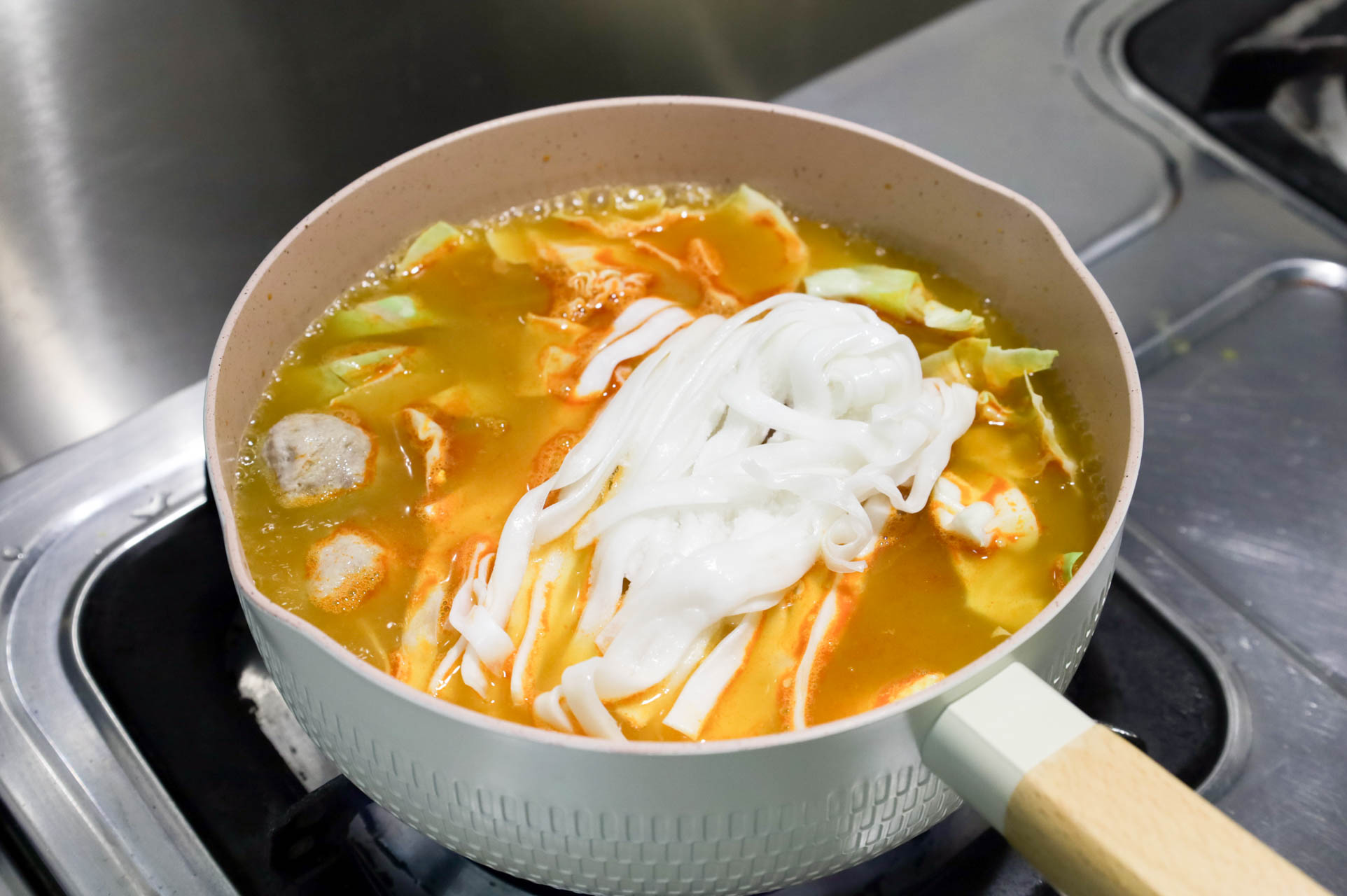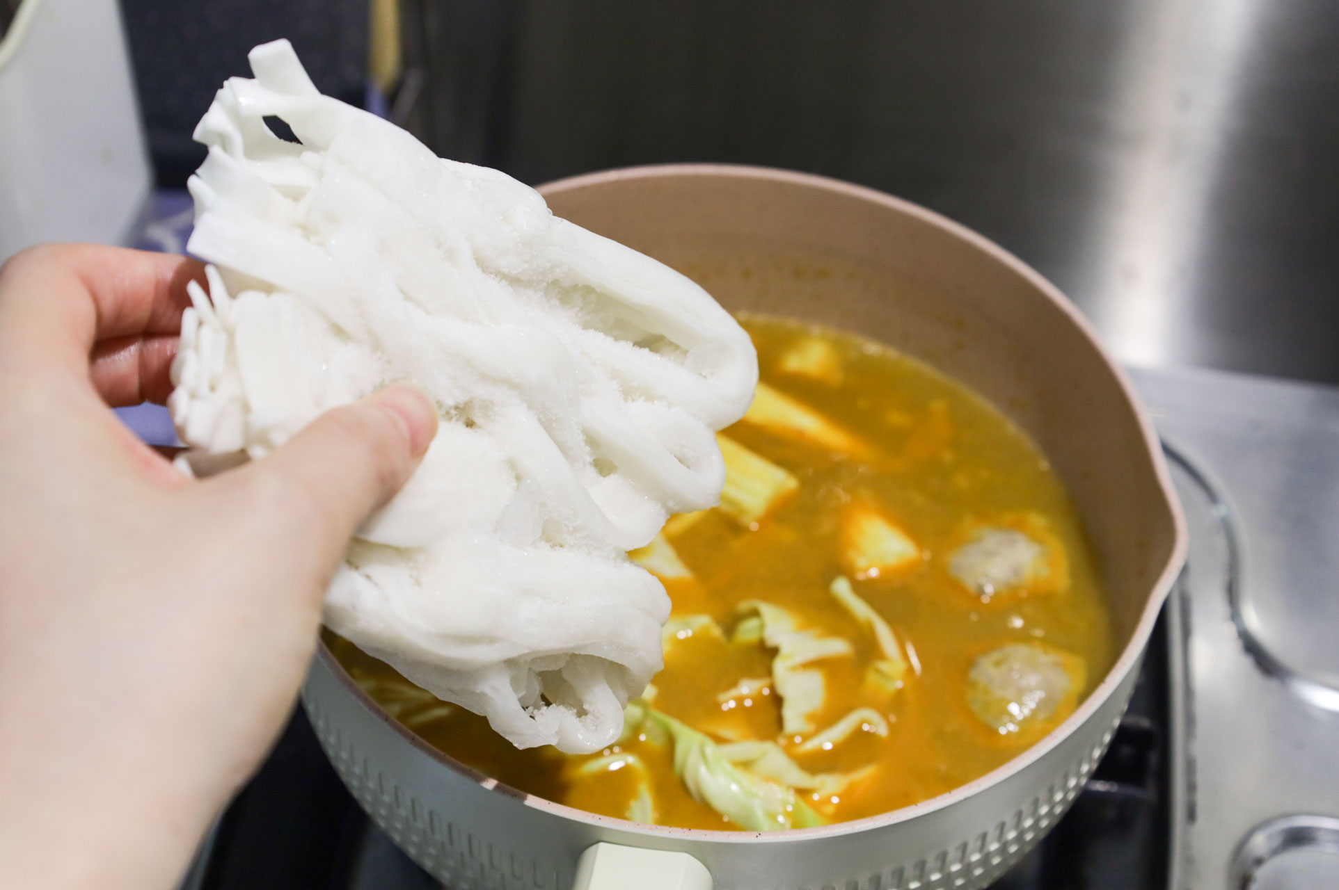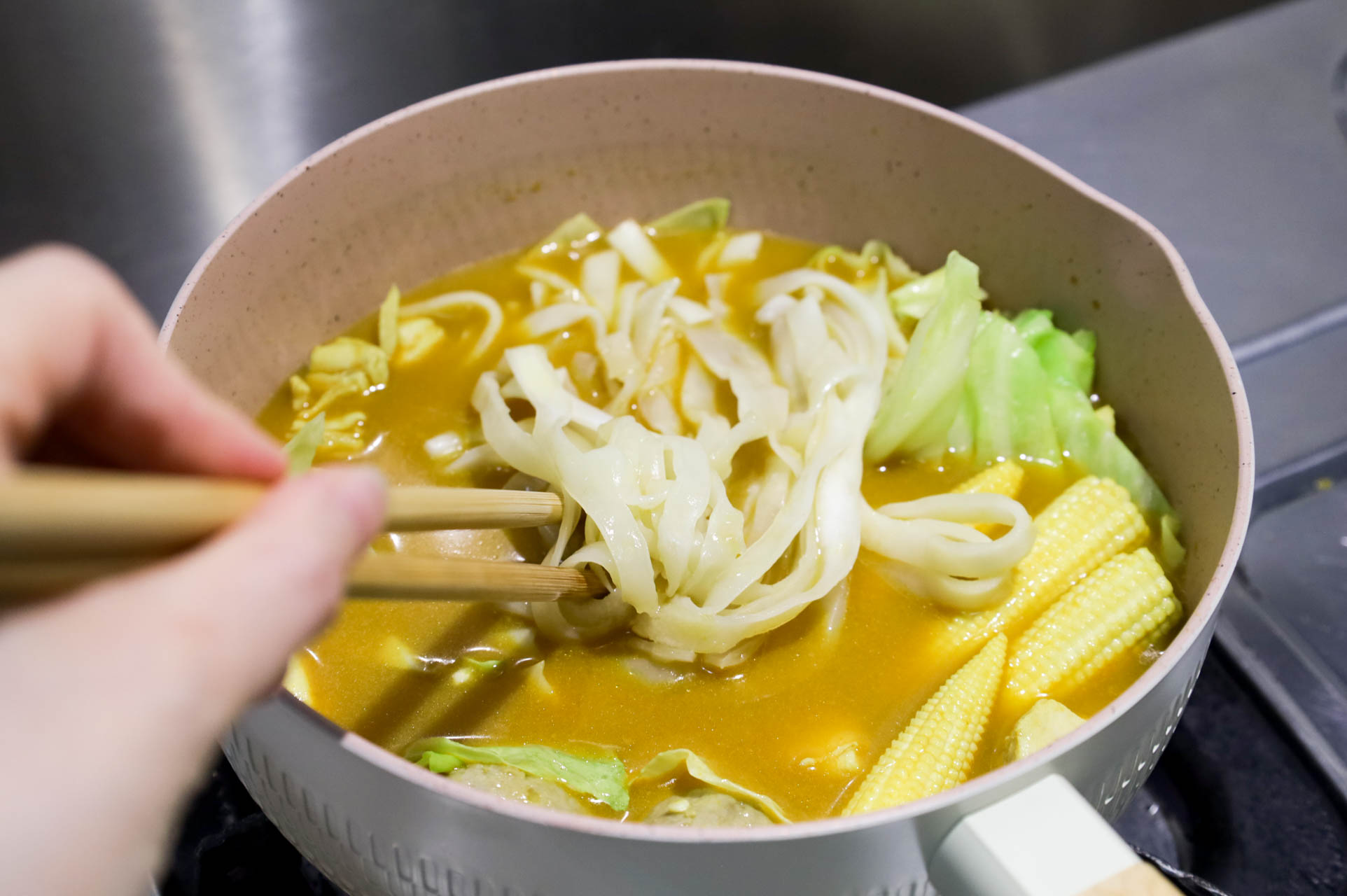 如果配料有放肉類、冷凍丸子,記得先下鍋煮。米米糆大概2分鐘就軟化熟透,所以建議最後在下鍋,避免影響口感。