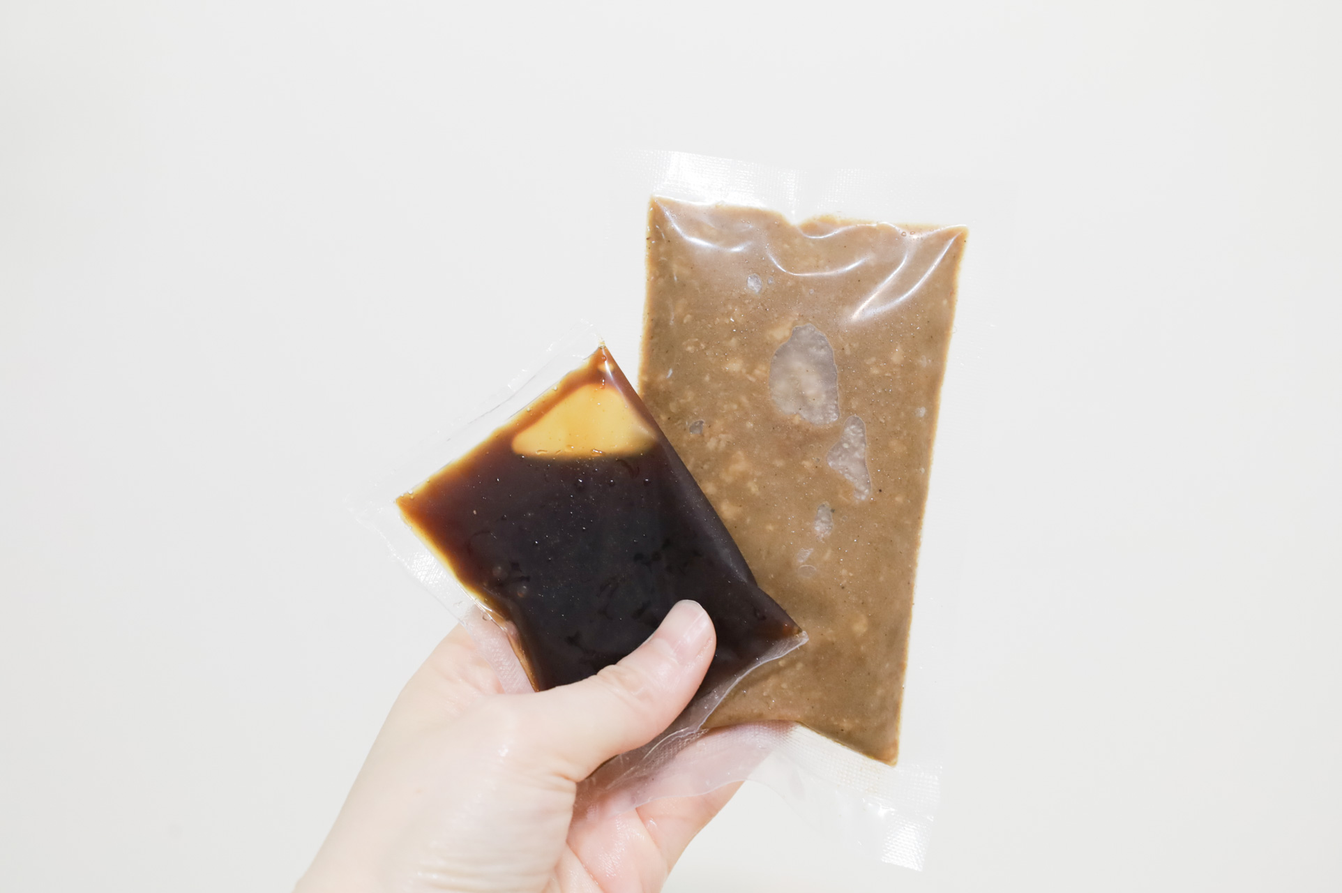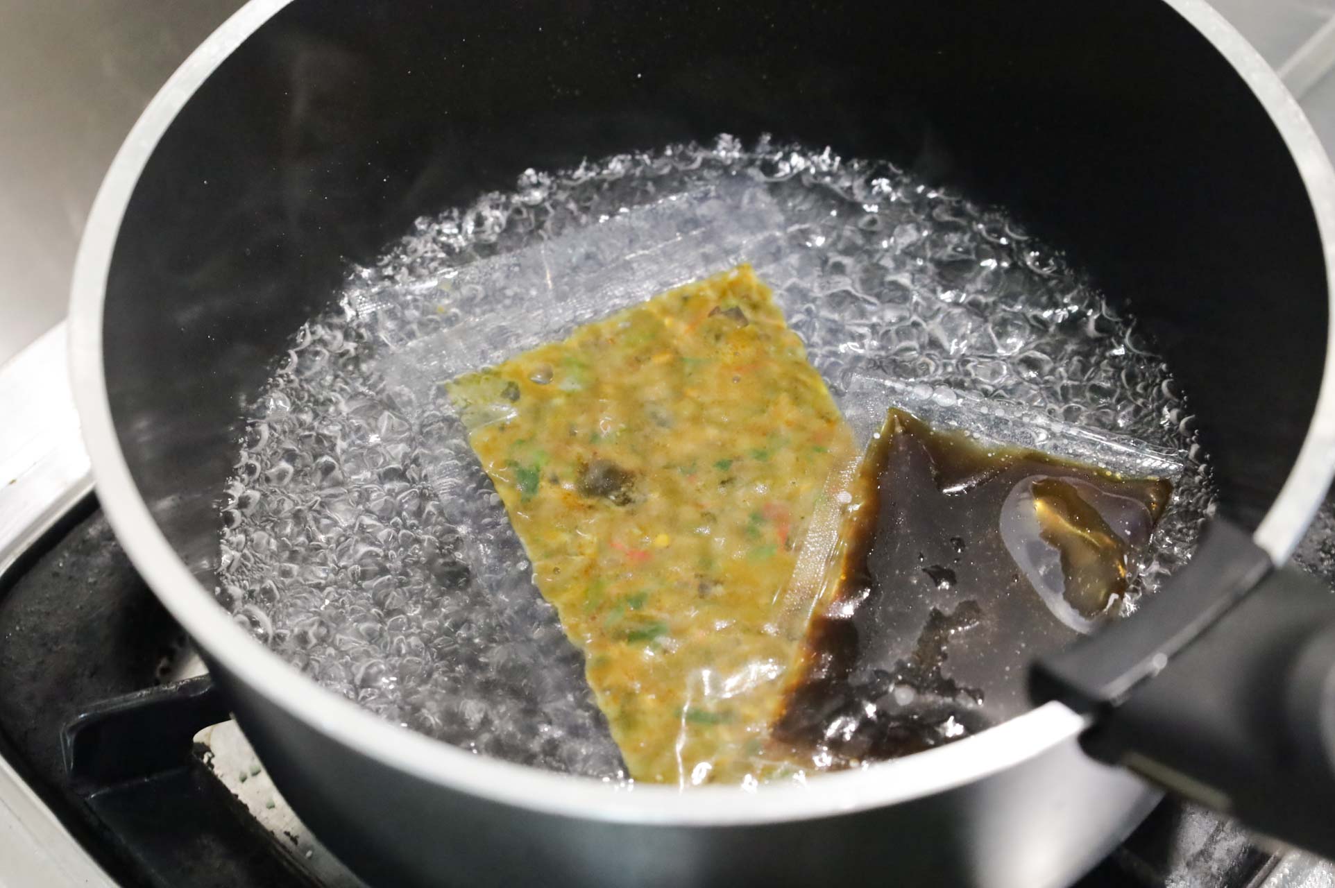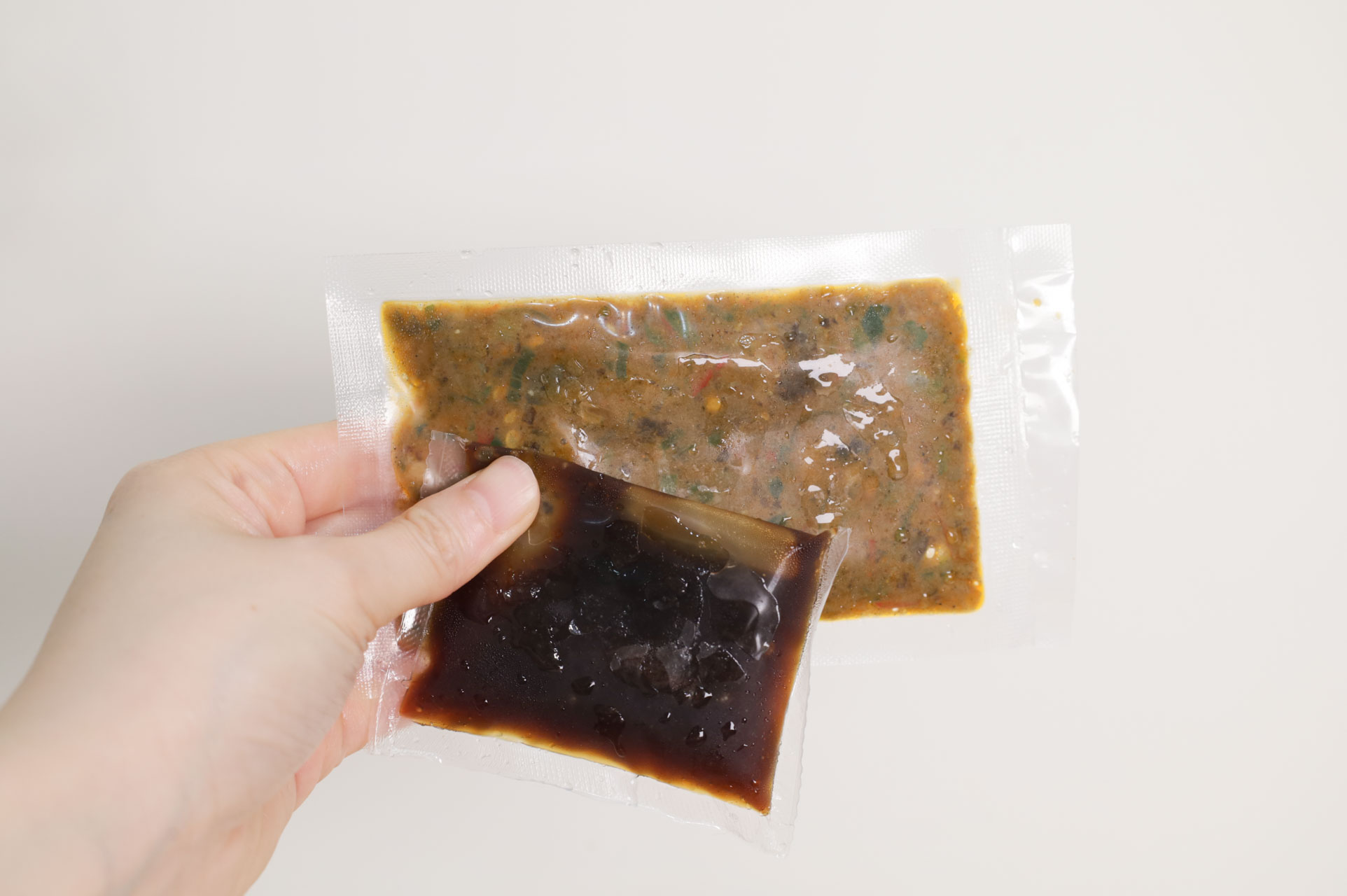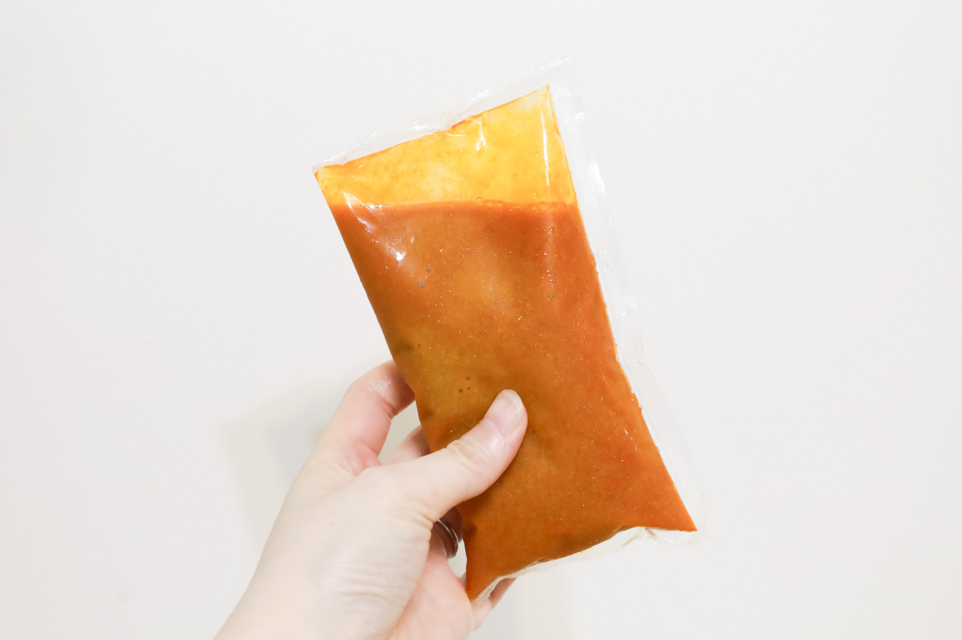 醬包原先是冷凍的狀態,可以隔水加熱3分鐘左右,或是拆開倒進碗中,直接微波也可以唷!