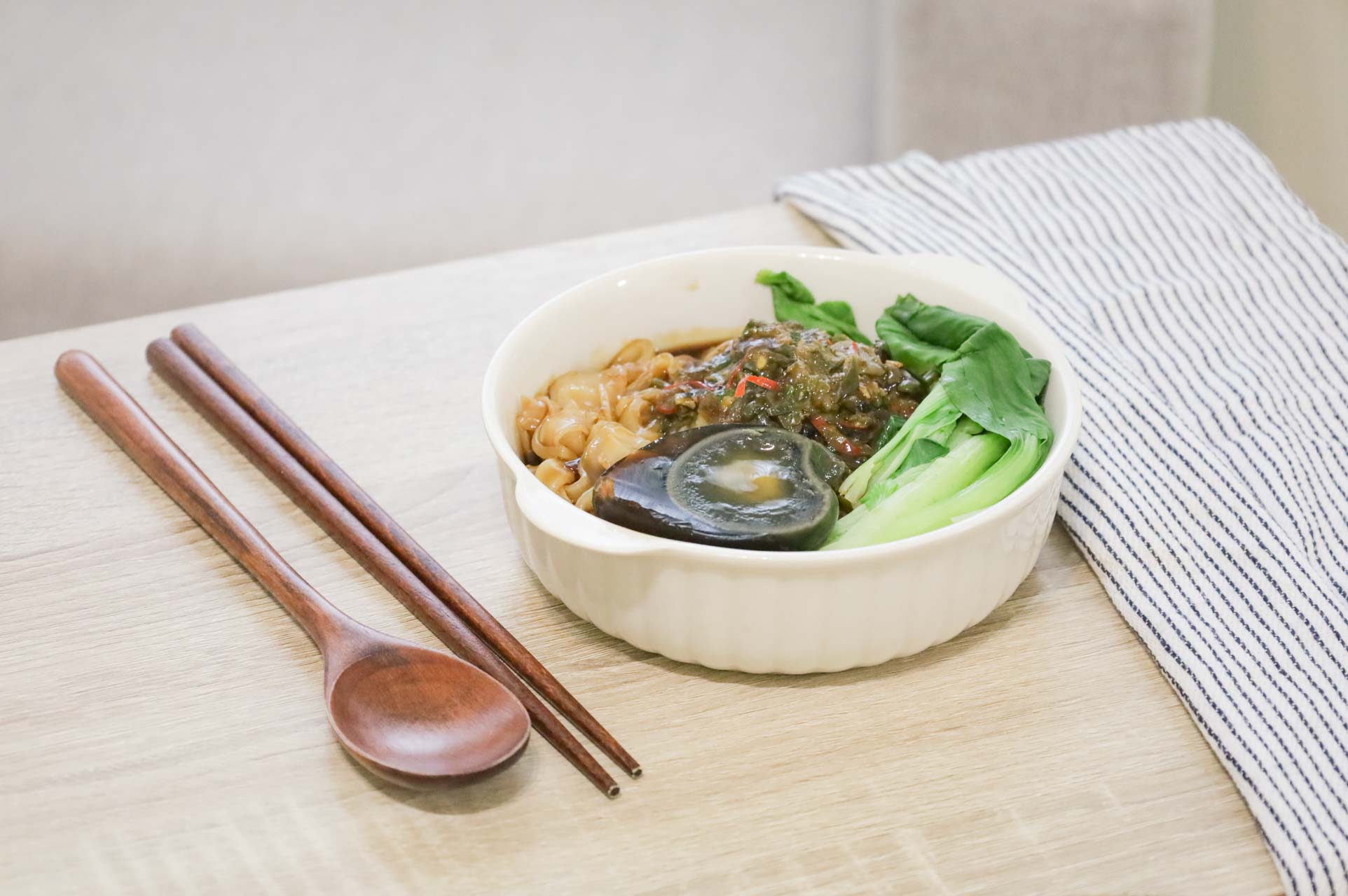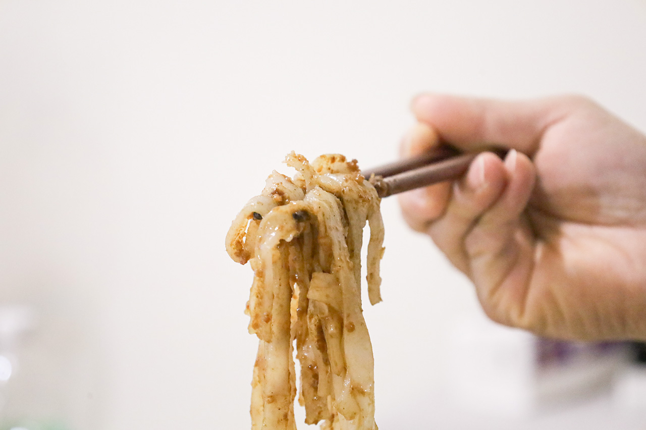 米米糆條Q彈,有點像板條,但米米糆比較薄,更能讓醬汁配料完整附著上。也展現皮蛋獨特滑嫩,增加柔順的口感。