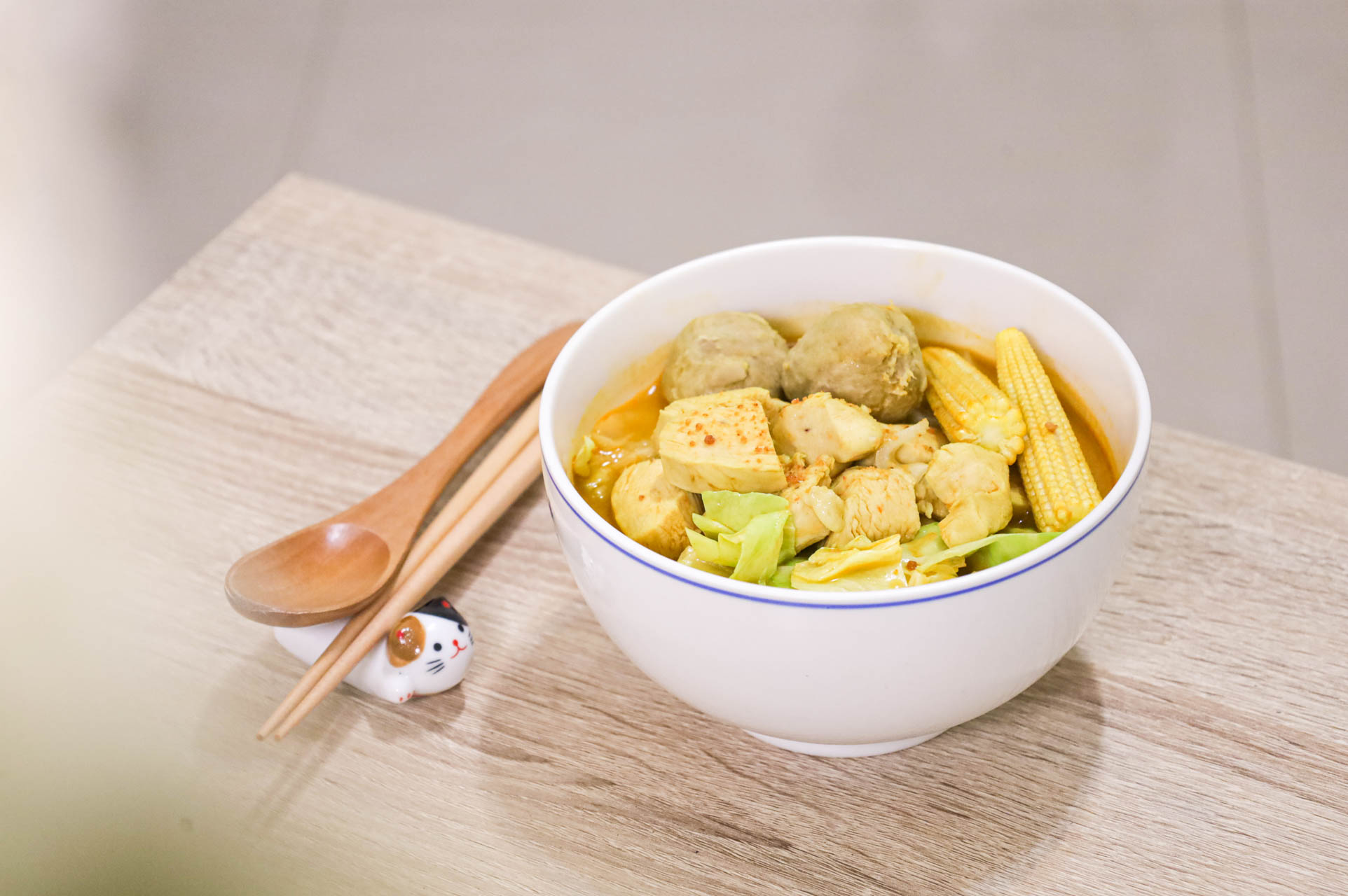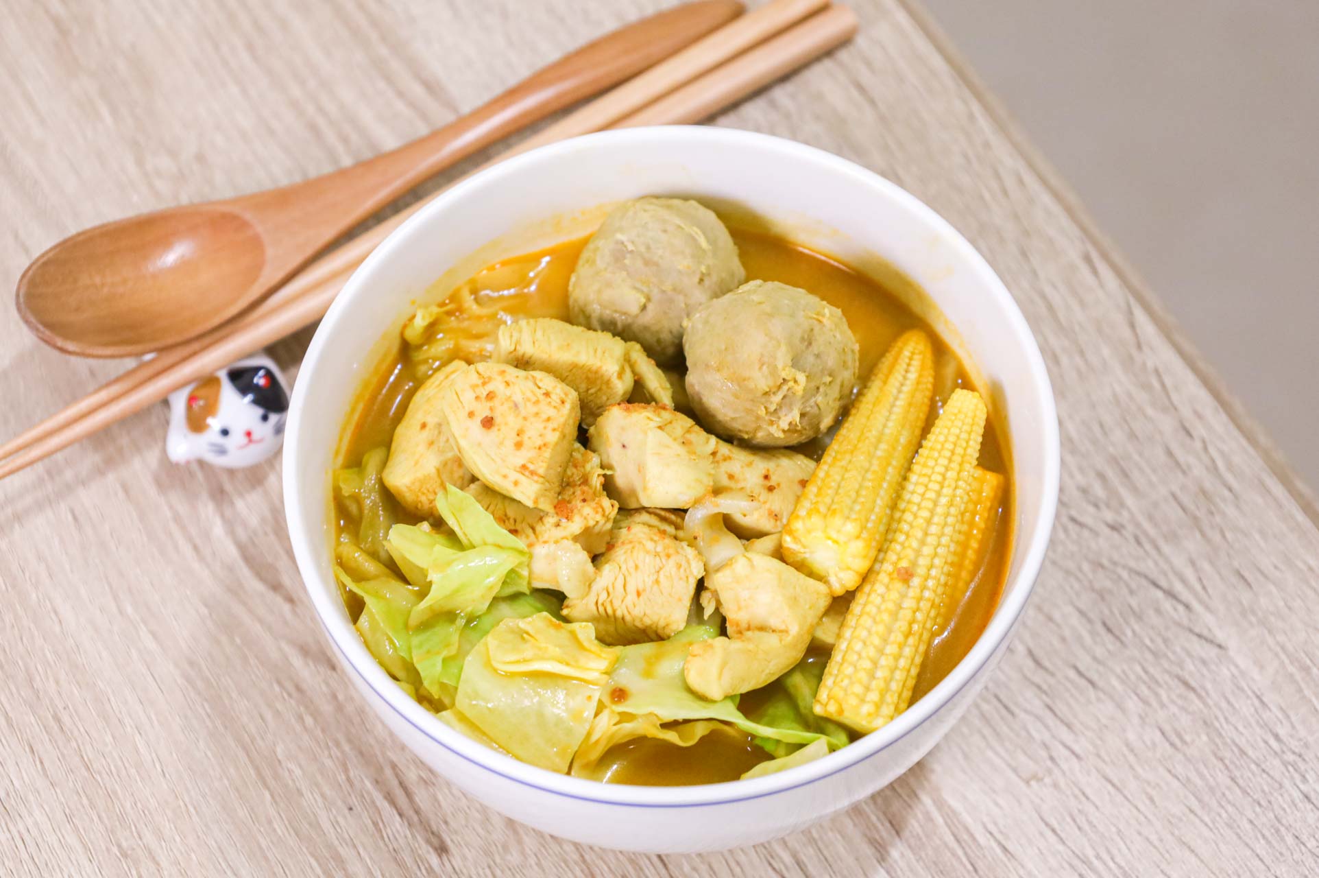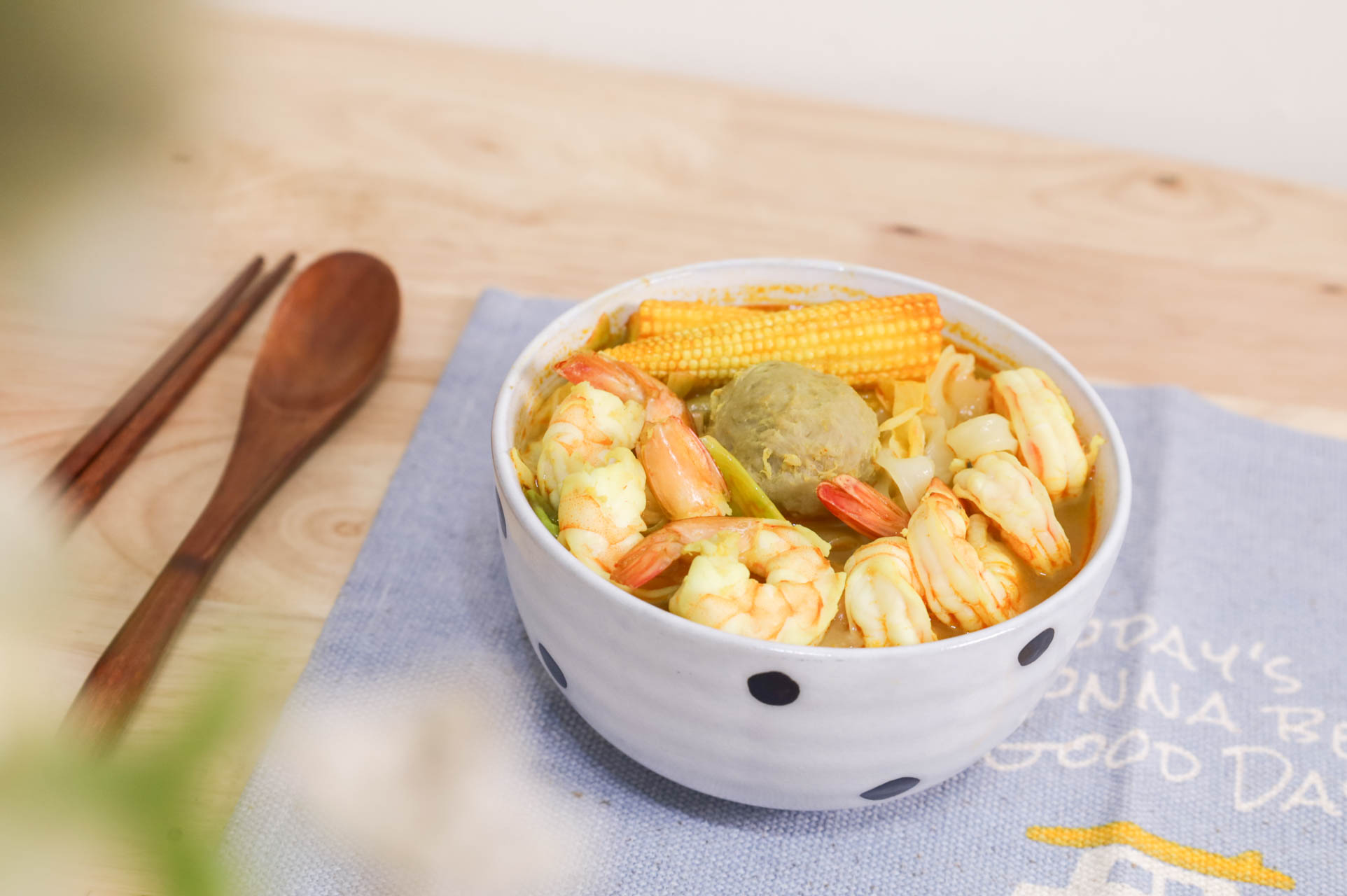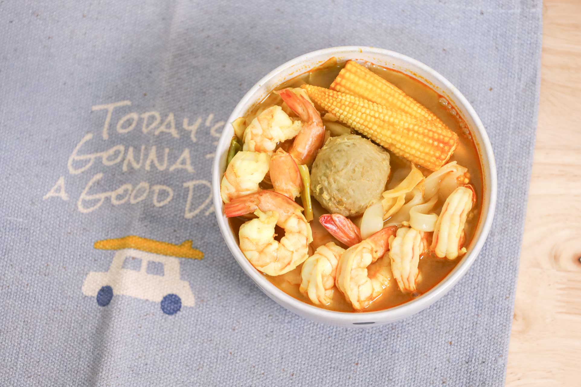 這款湯底採用近20種香料與食材煸製,還原道地東南亞風味。吃起來的辣度比叻沙椰漿低一些,帶有檸檬草與香茅的清新香氣,搭配蝦子更添鮮味,我自己滿喜歡的。