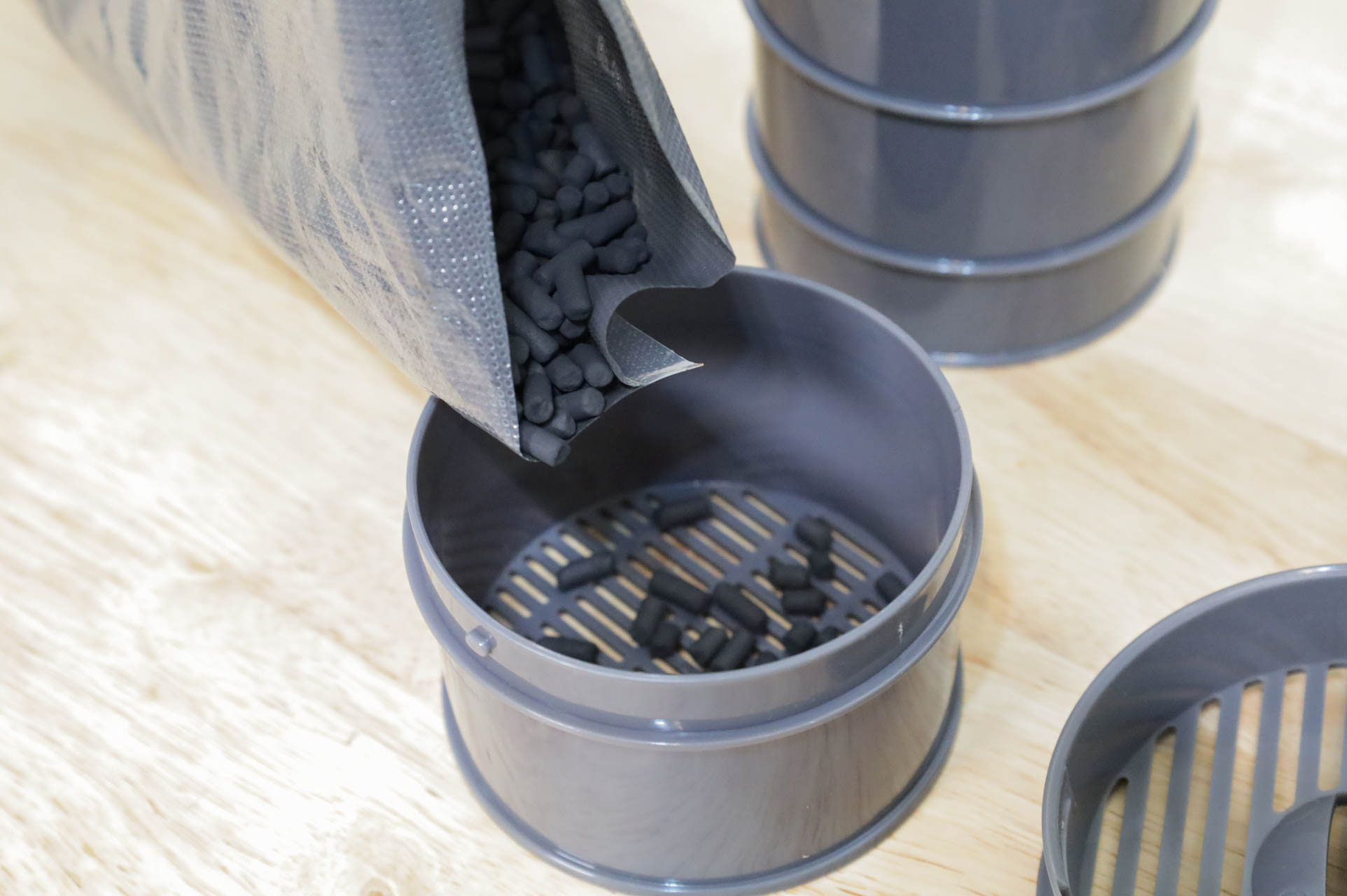 取適量的活性碳放入過濾盒,順時針關閉即可。