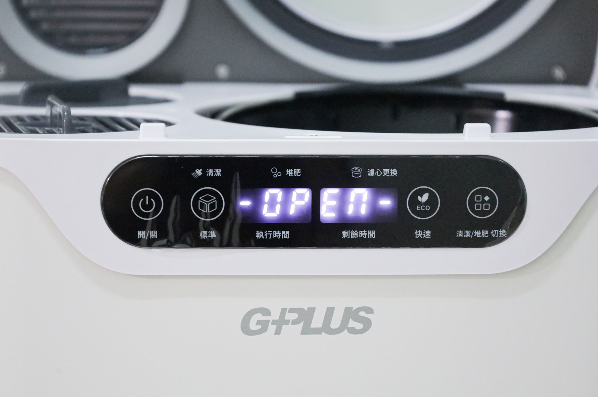 假設廚餘機已經運作中,只要按壓開蓋鈕,廚餘機馬上會暫停,這也算是安全機制設計了。