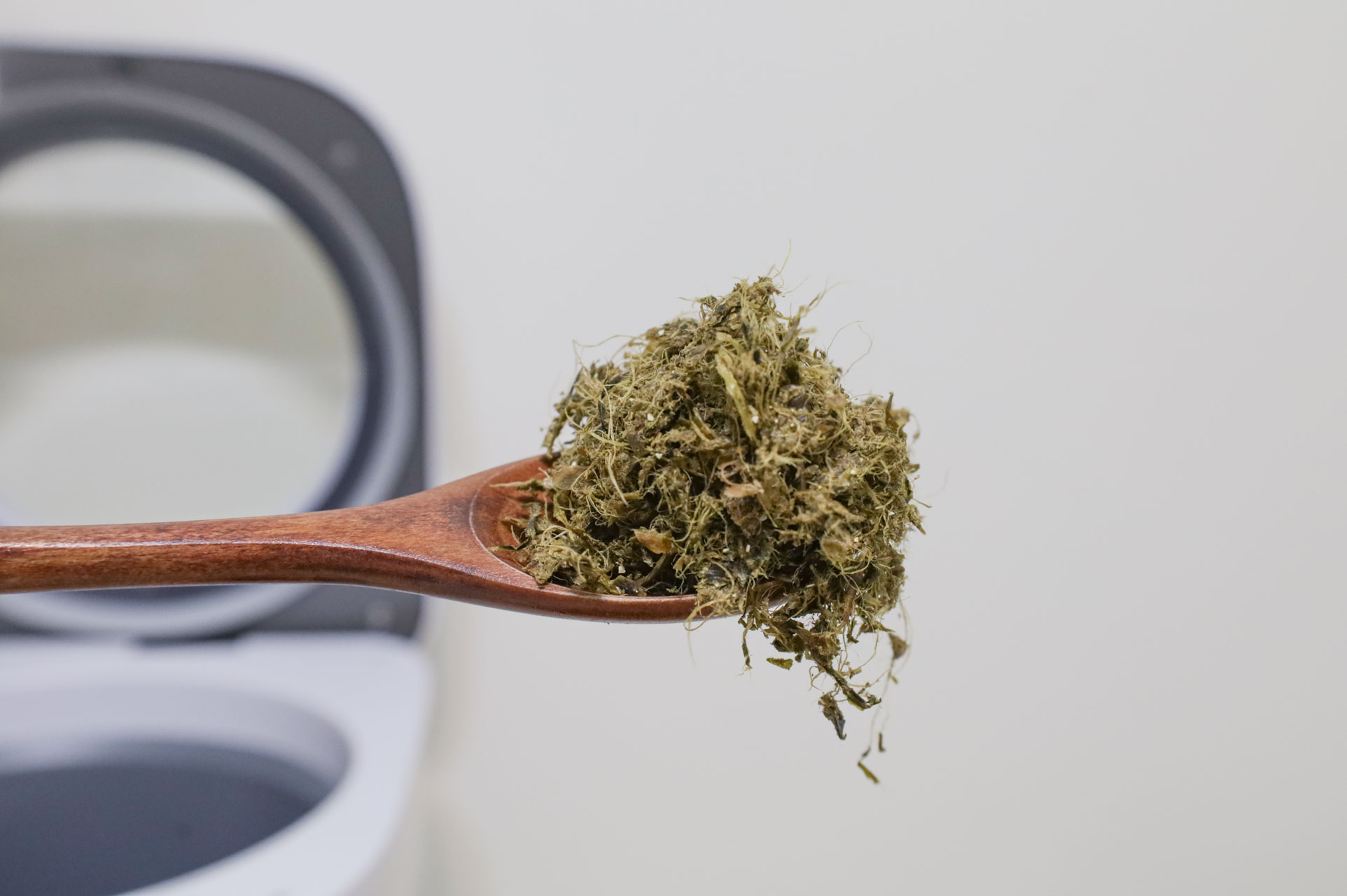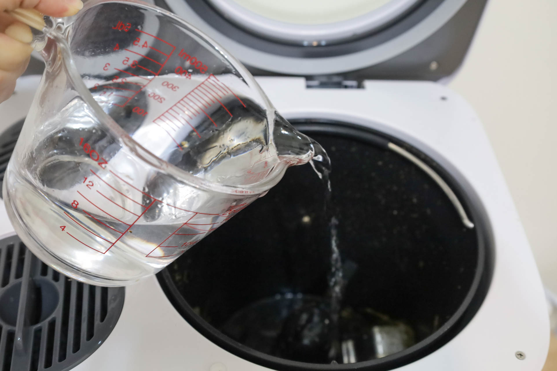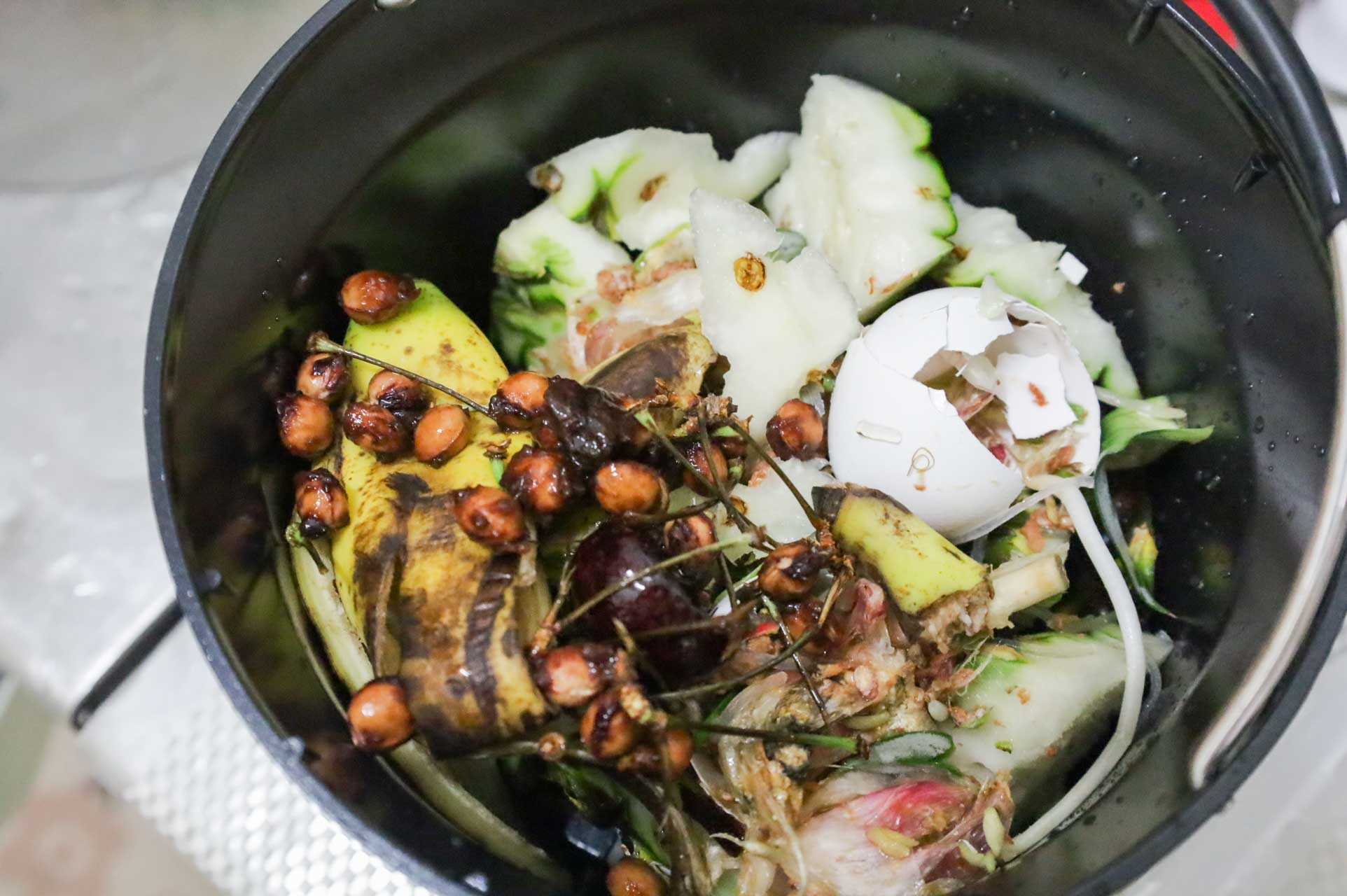後來將廚餘機放到廚房檯面,還可以隨手處理廚餘。因為有密封蓋設計,所以食物殘渣就不會暴露在洗手槽,引來果蠅或蟑螂,等累積到一定的量,就可以立即製作乾廚餘,相當便利~