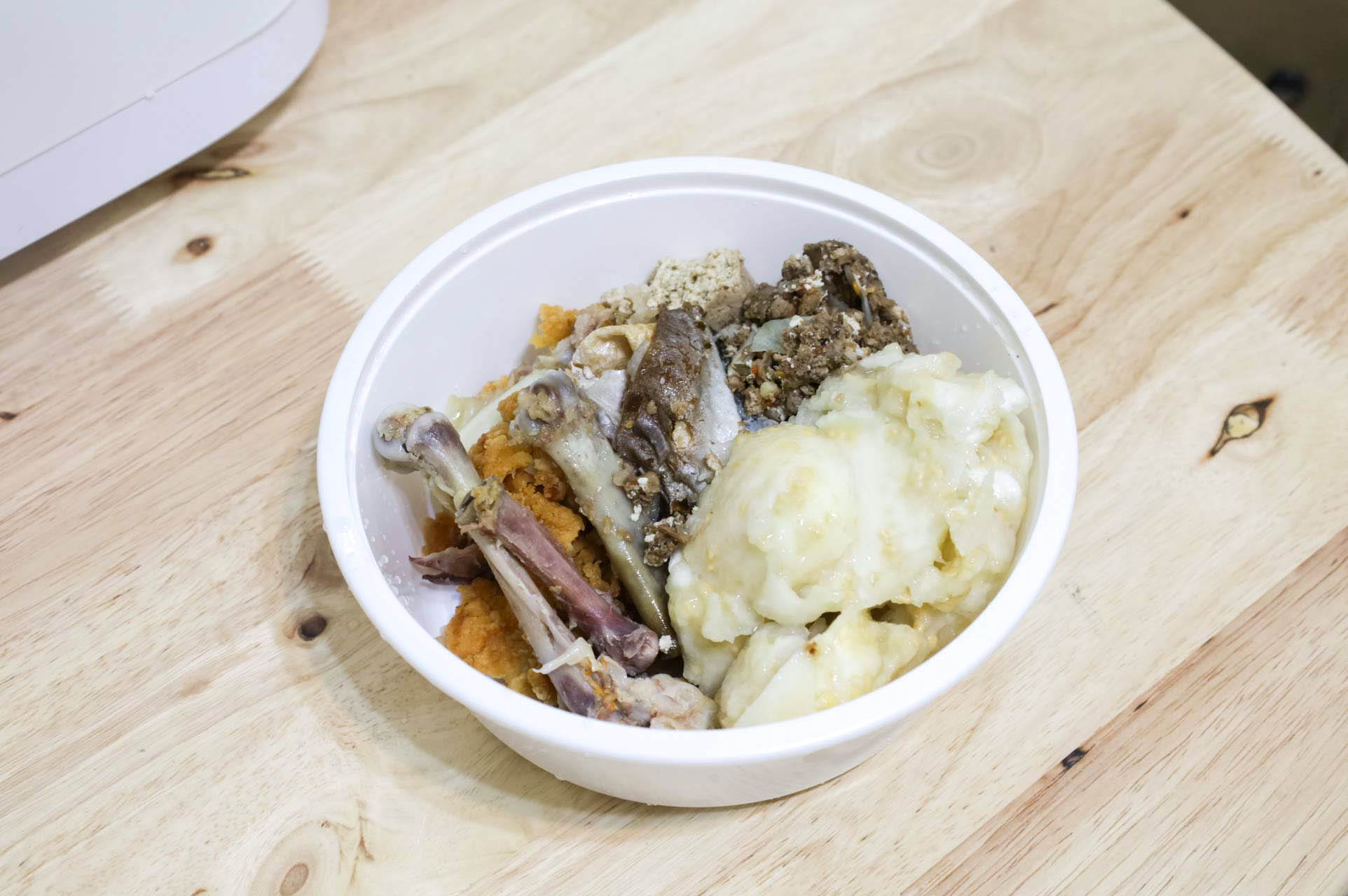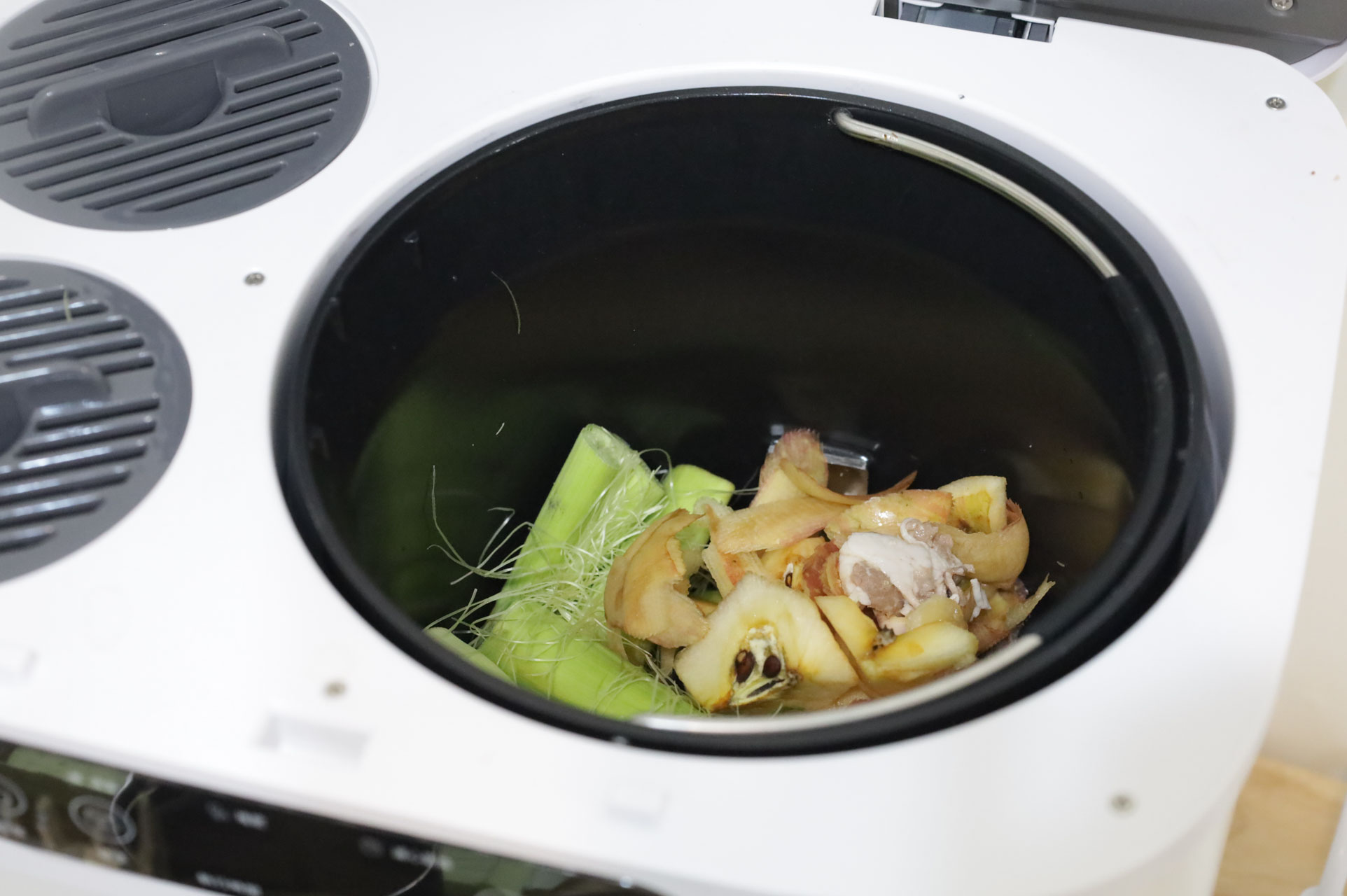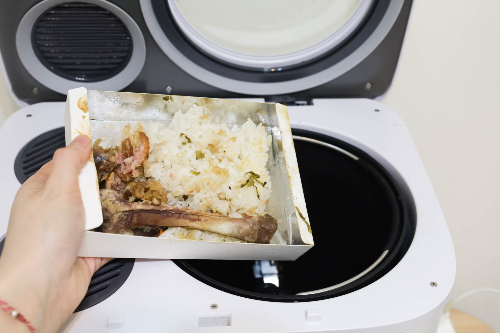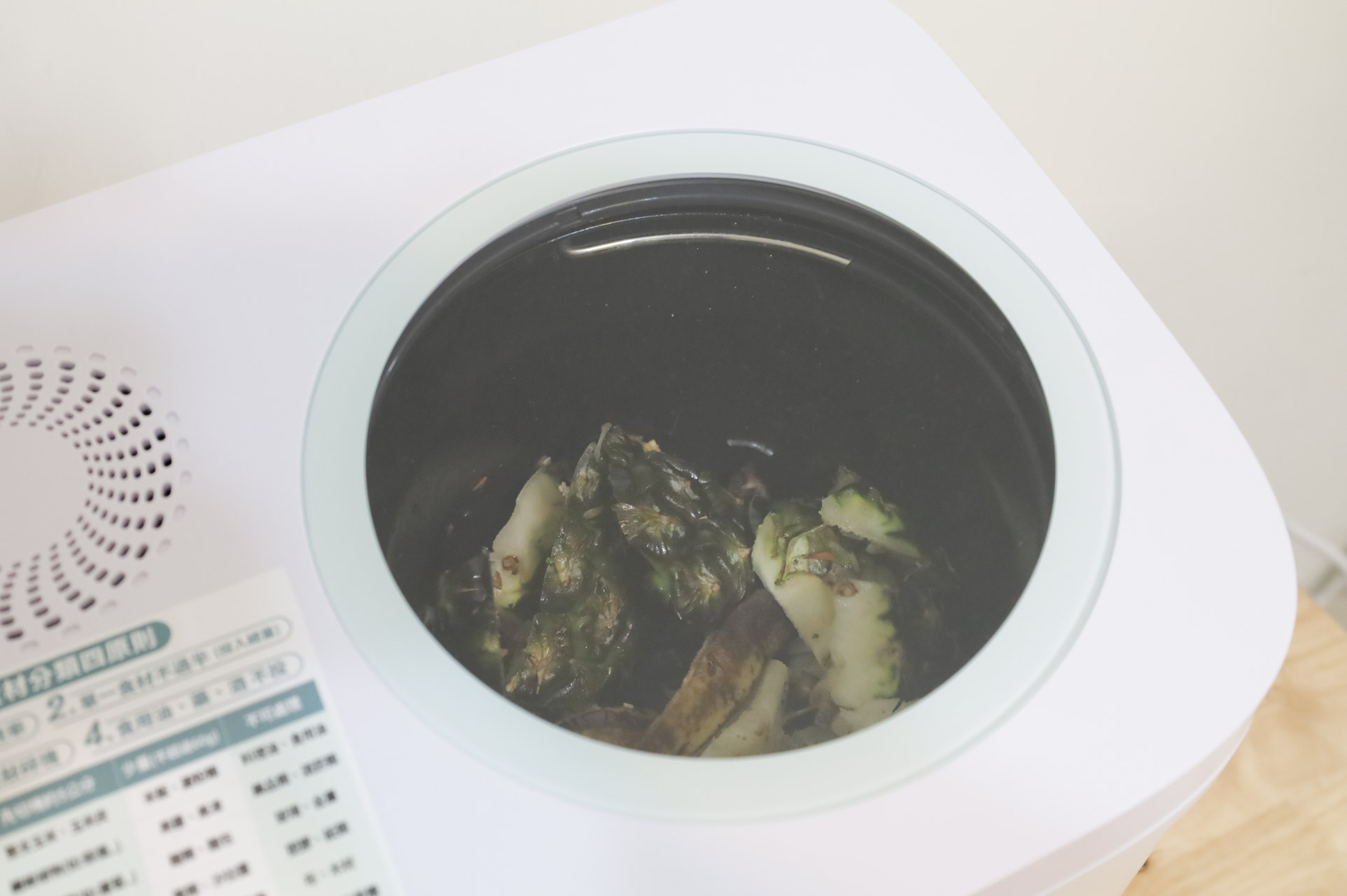 這次放的廚餘有比較多骨頭和油脂,運作過程中一樣沒有太多的異味。打開蓋子才聞到烘烤食物氣味。