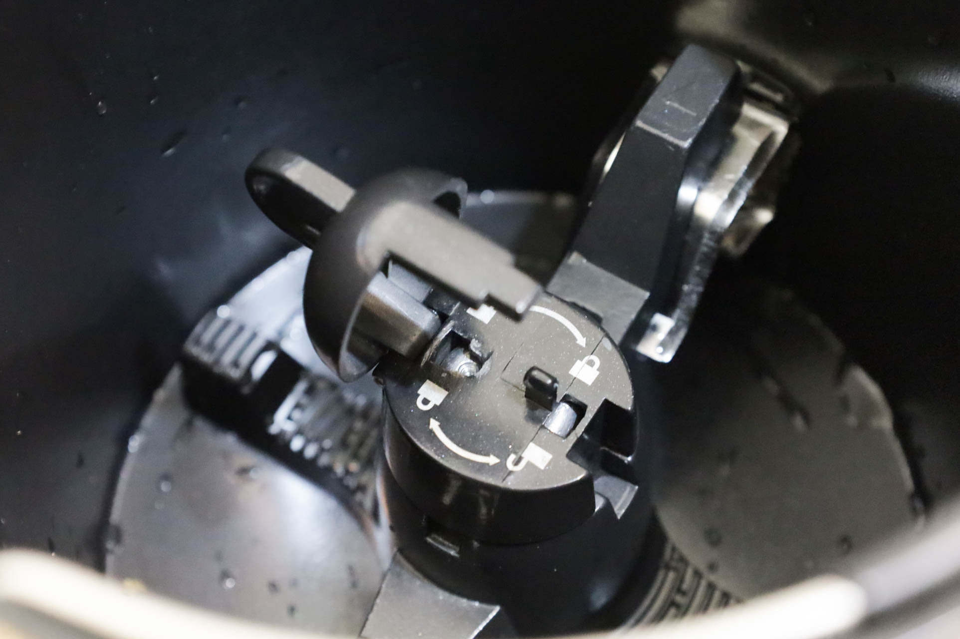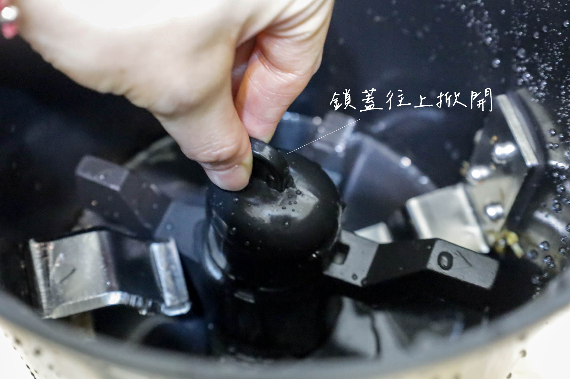 X型攪拌槳是可以拆解,這樣能把攪拌鍋清潔更徹底。手指先捏著鎖蓋往上掀開。