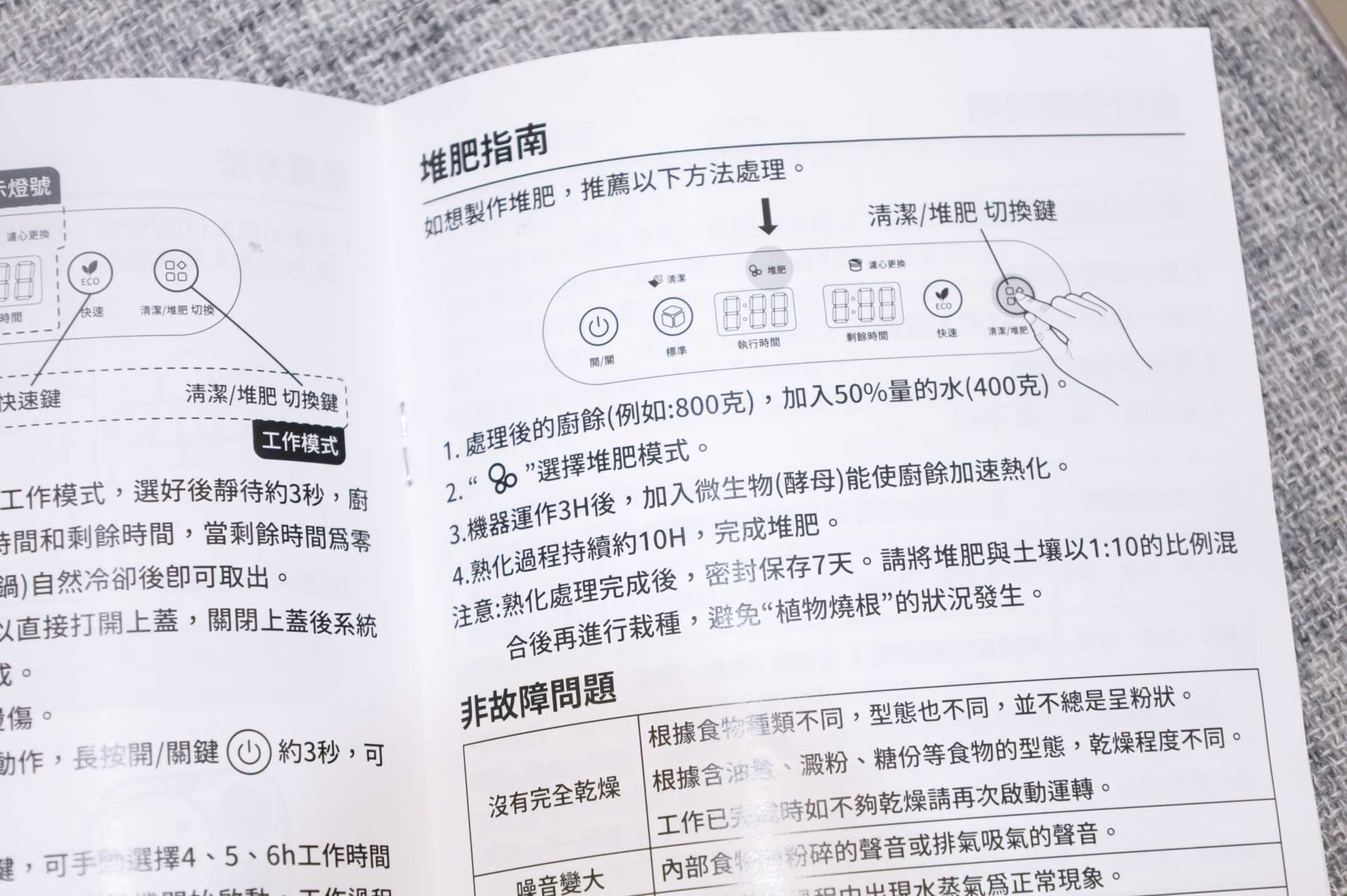 說明書有介紹,製作植物堆肥使用使用生廚餘,像是蔬菜果皮這些都可以。